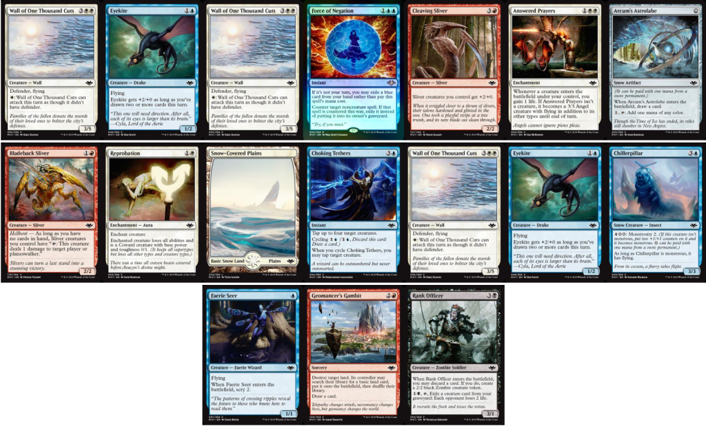 At the end of pack three, we find that we strayed from our original plans a bit. While we picked up some good Slivers and white cards, we also had to dip into blue as well. Thankfully, a good amount of our blue picks wear the flying keyword. Now that we have finished drafting, its time to build a deck.